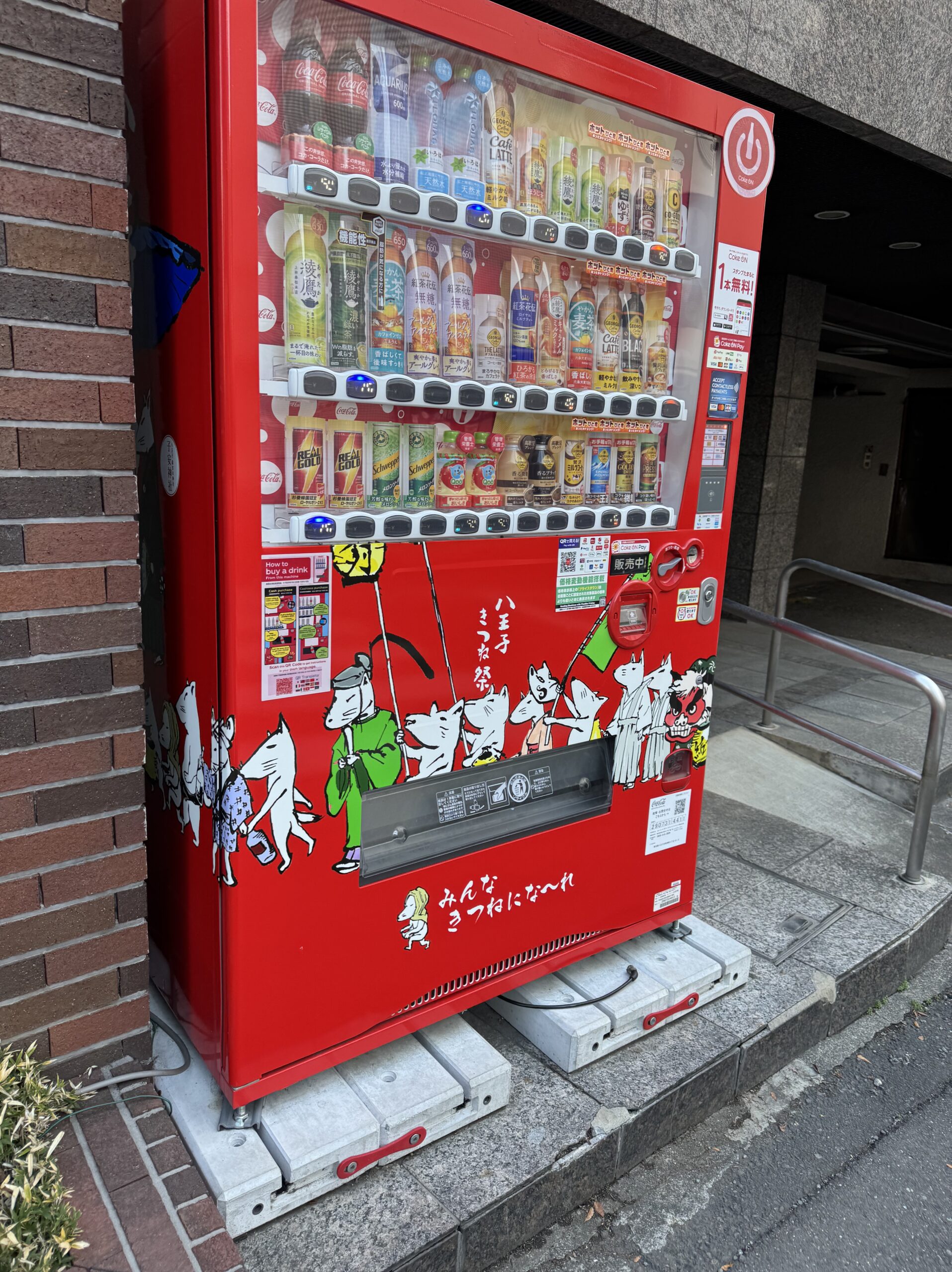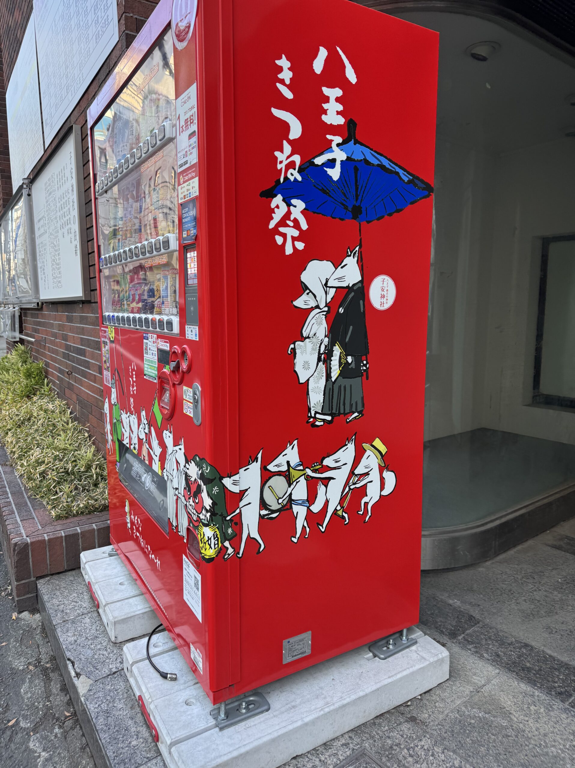 子安神社の由来の右側には「きつね祭り」が描かれた自動販売機があり、これも何かを意味しているのではないかなぁと思いました。キャラクターの中に特別な模様の服を着たキャラがいないかなど細かいところをチェックしました。