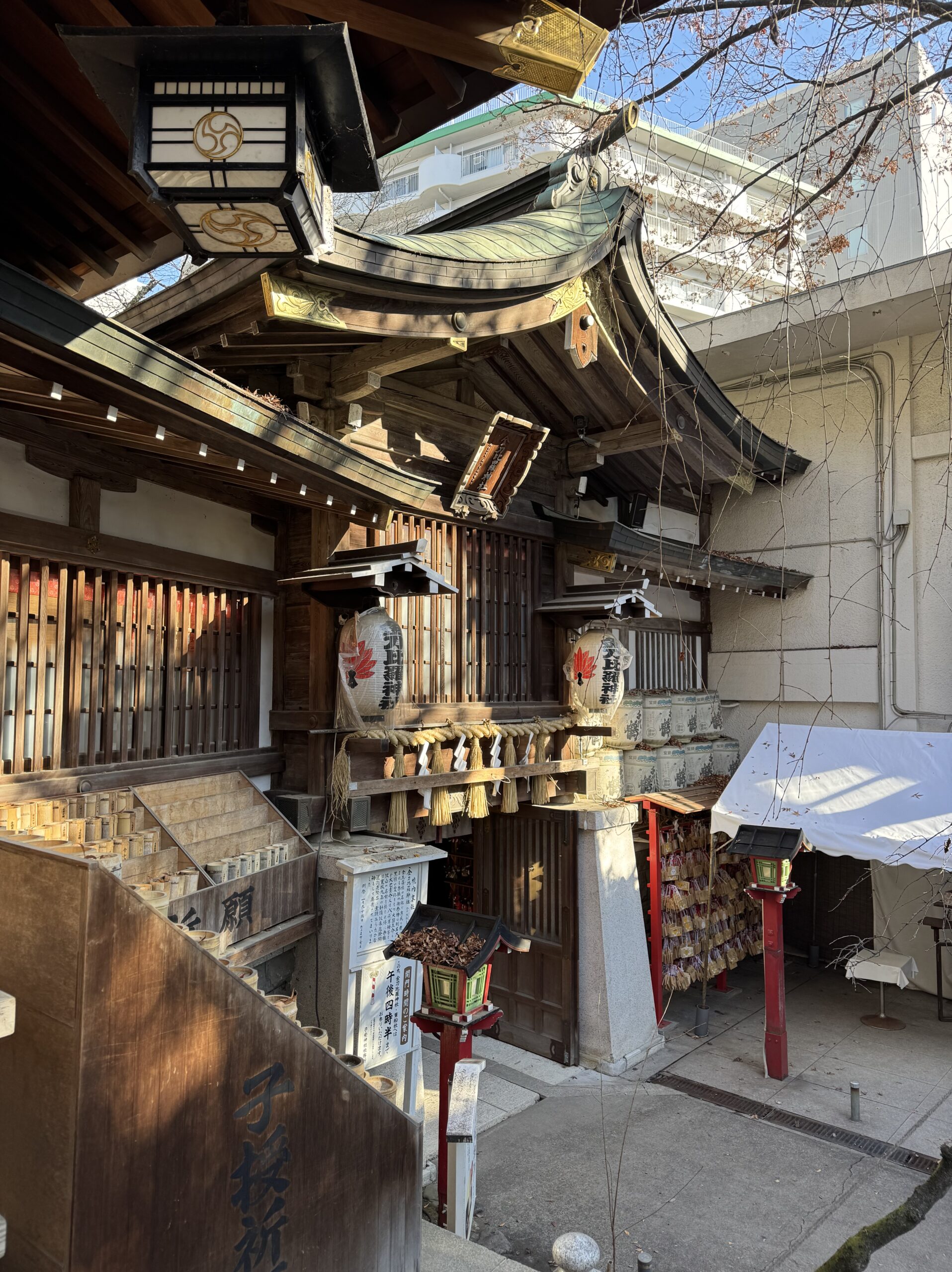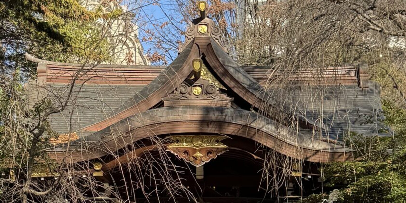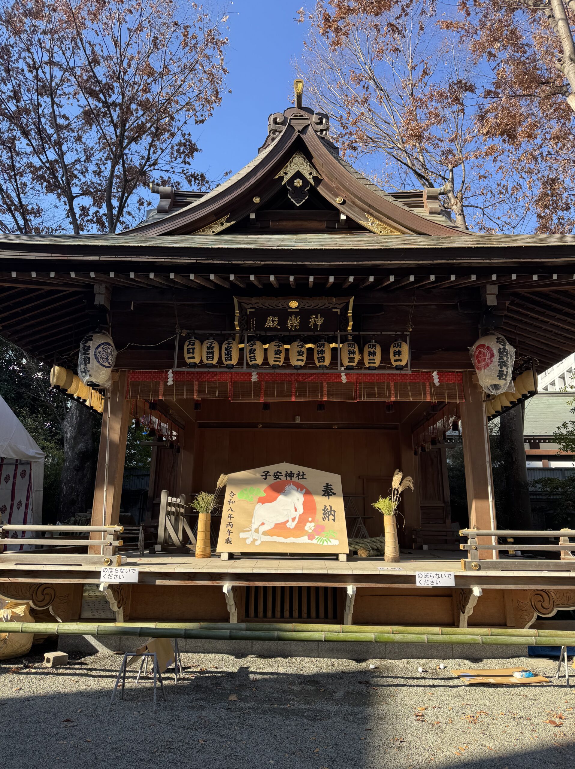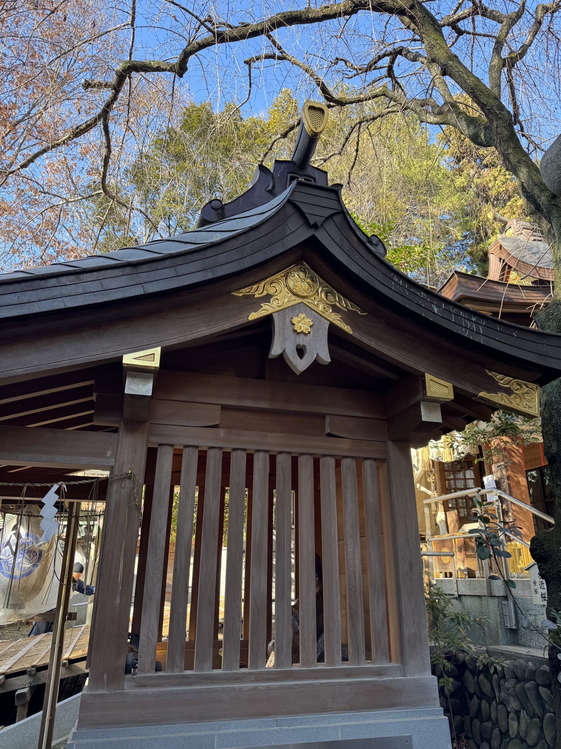 神楽殿です、屋根の飾り部分などに細かい模様などにも注目して、見るようにしています。ハートのようなマークや六芒星のような形のものがあるように感じました。