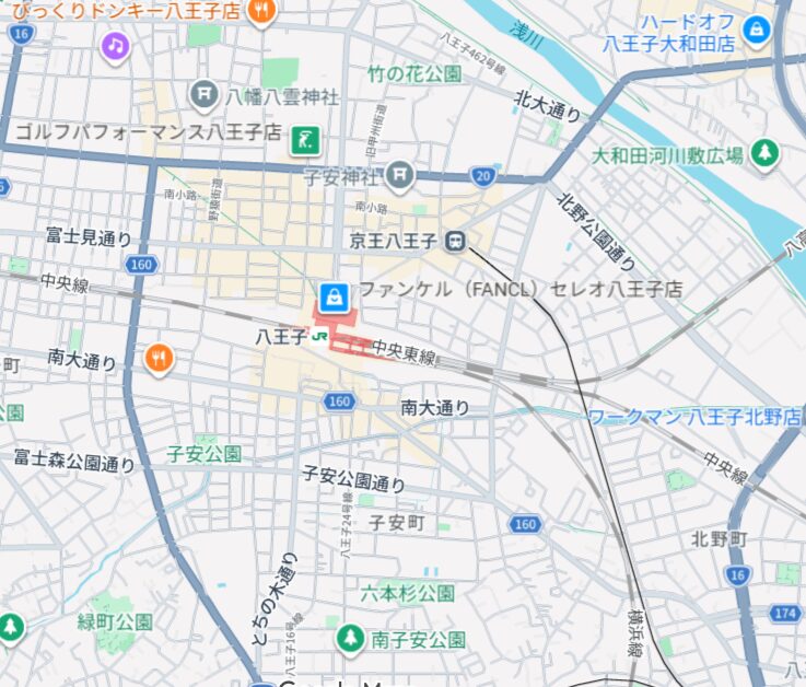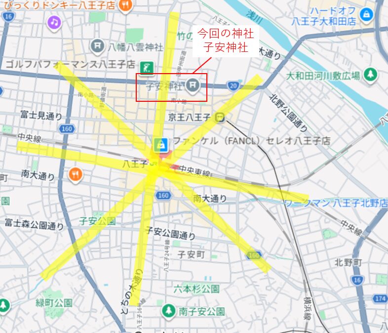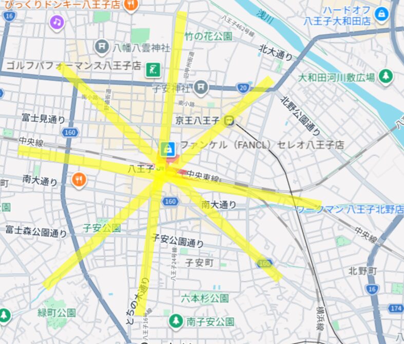 Googleマップでこのエリアの中心的な場所を見てみると、八王子駅を中心に8方向に向かって伸びる道の名残を感じました。