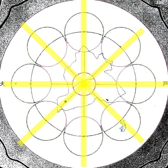 この八方向に伸びる道は、愛智神話では「八坂」などと呼ばれ「八巣の世界」(神代の自然公園のような場所)を造るために非常に重要なエネルギーの通り道だと言われています。