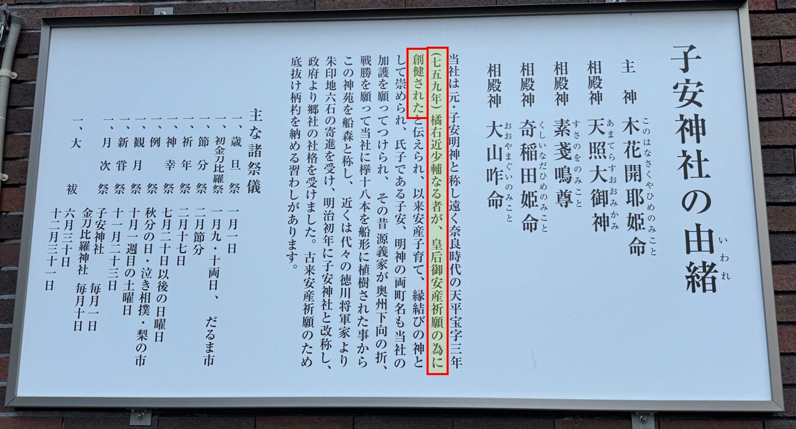 入り口右側には、子安神社の由来が書かれた看板がありました。